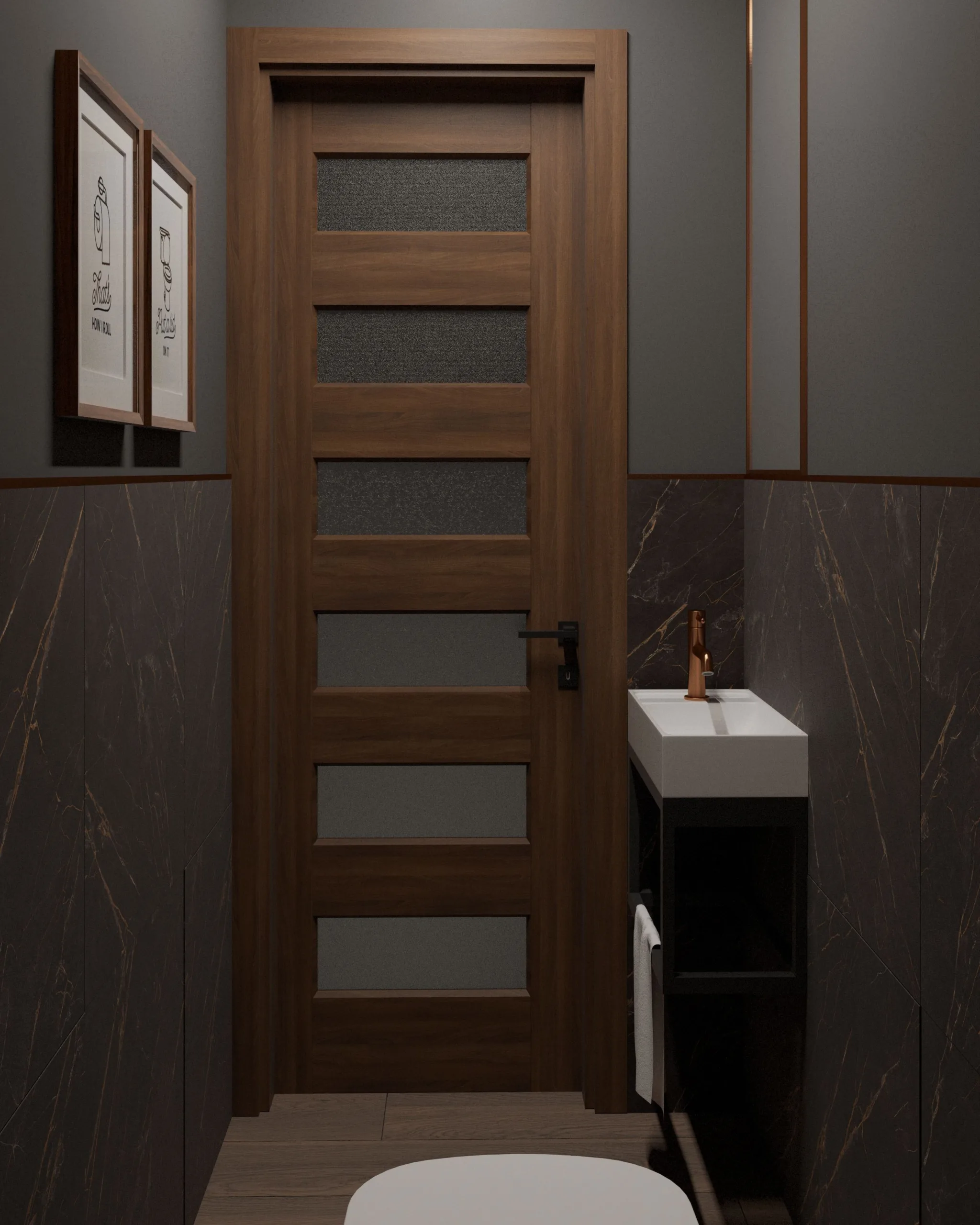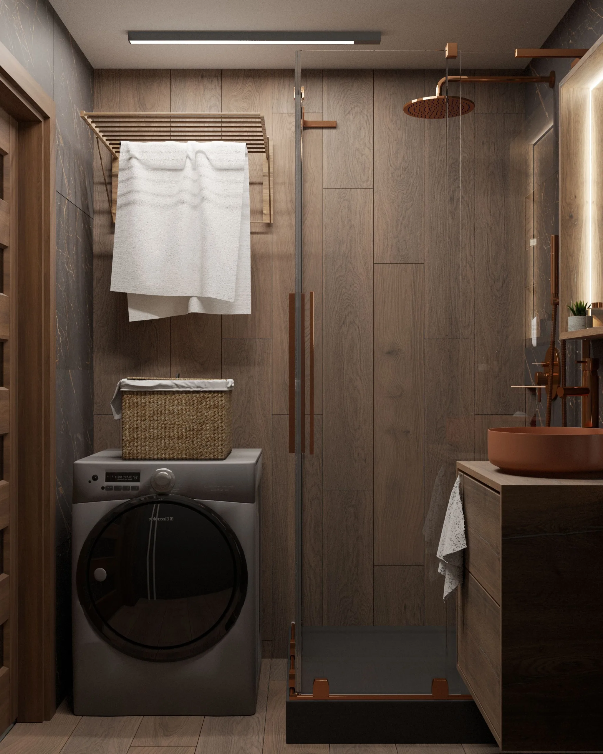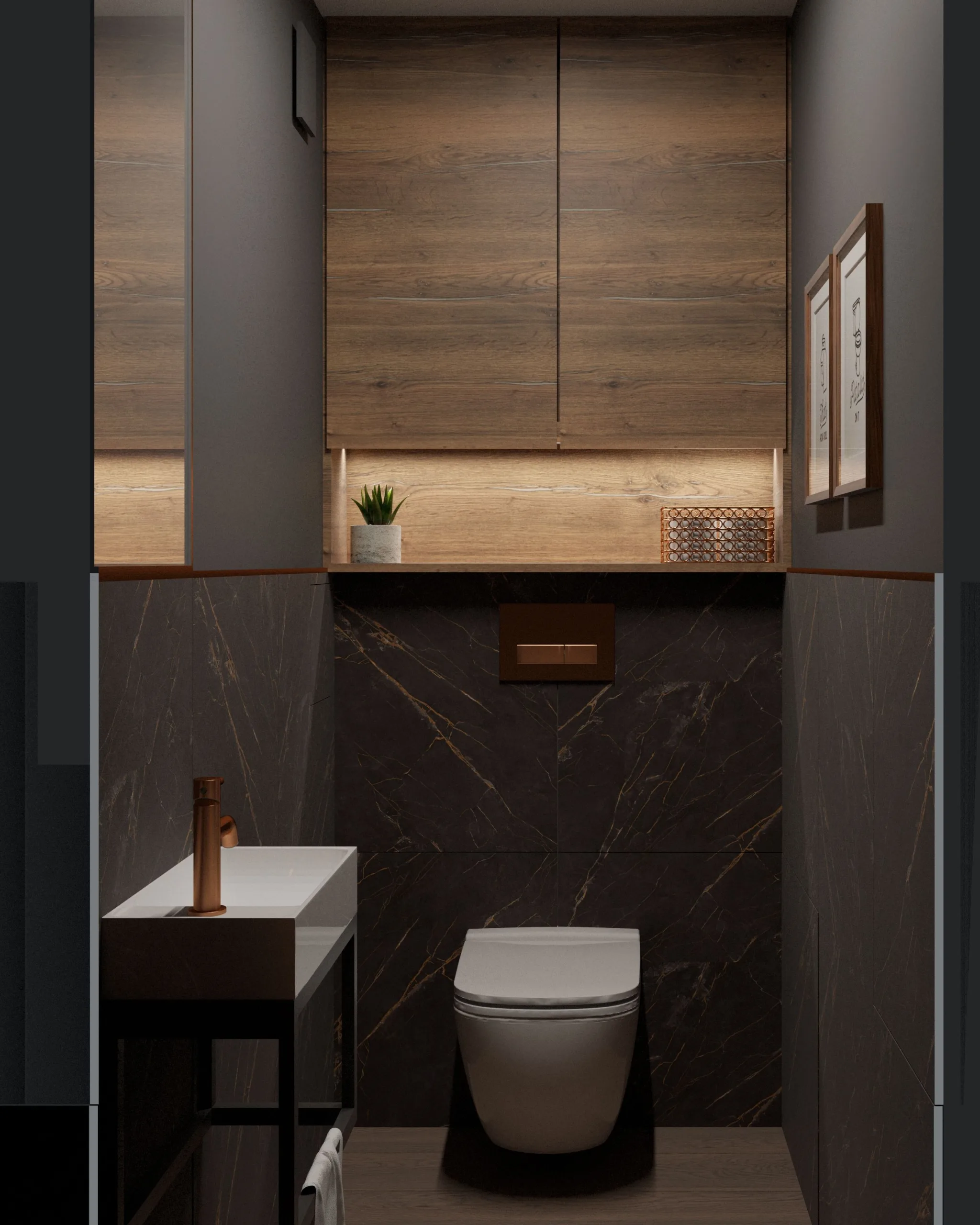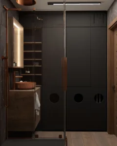 Łazienka utrzymana jest w nowoczesnej, minimalistycznej estetyce, w której dominują czarne płytki z miedzianym przeżyleniem. Mimo niewielkiej powierzchni wnętrze nie przytłacza – przeciwnie, tworzy poczucie luksusowej intymności. Kluczem jest gra światła i faktur, które nadają przestrzeni głębi i wyrafinowania.