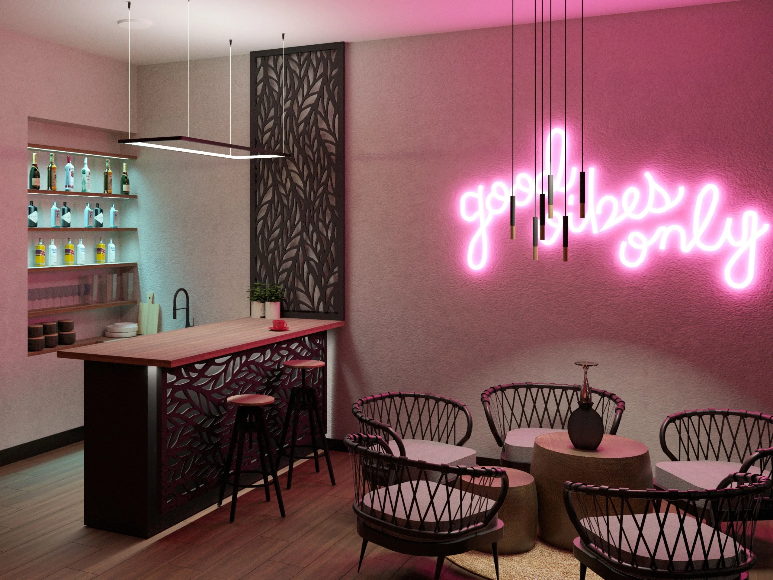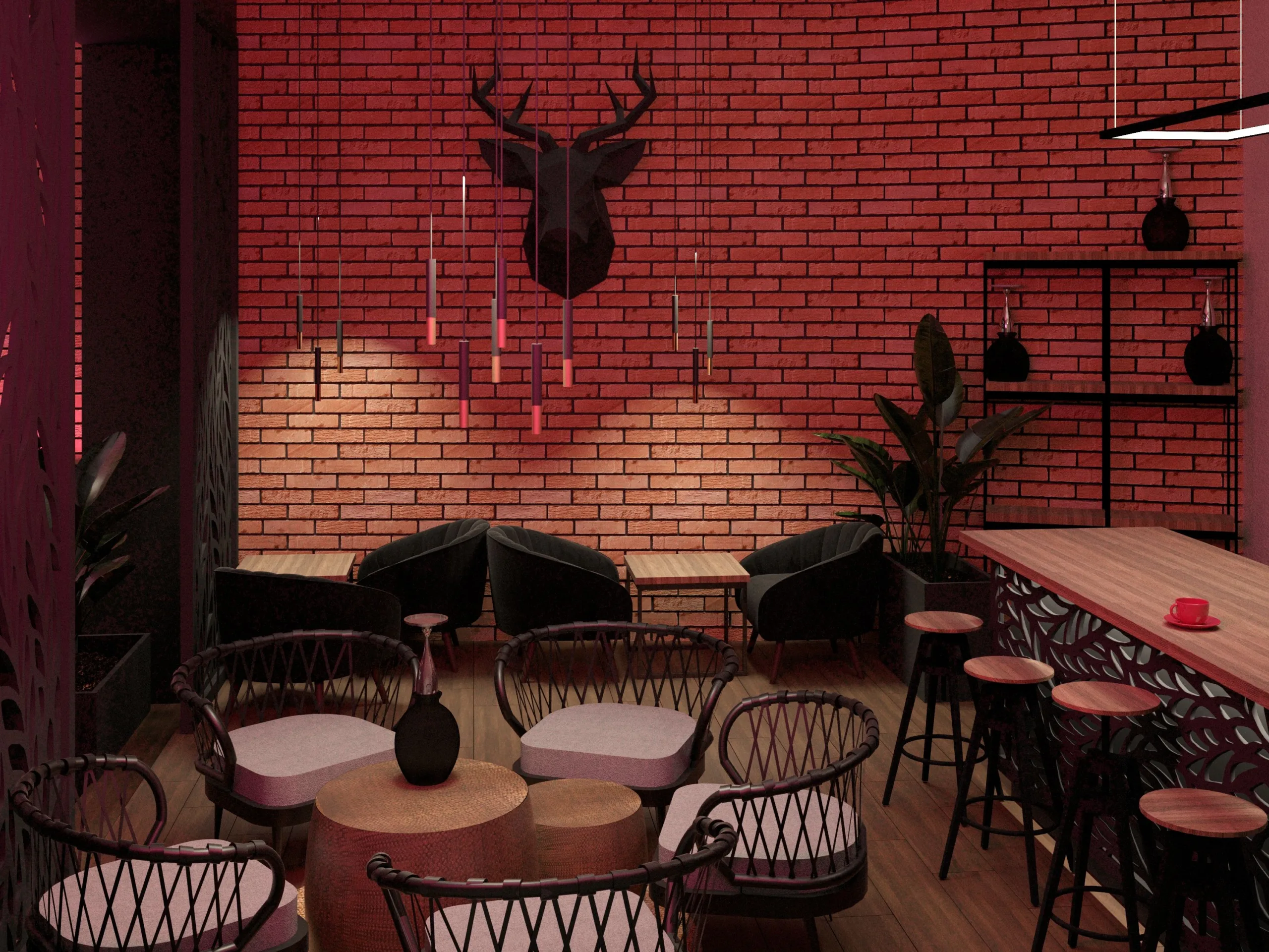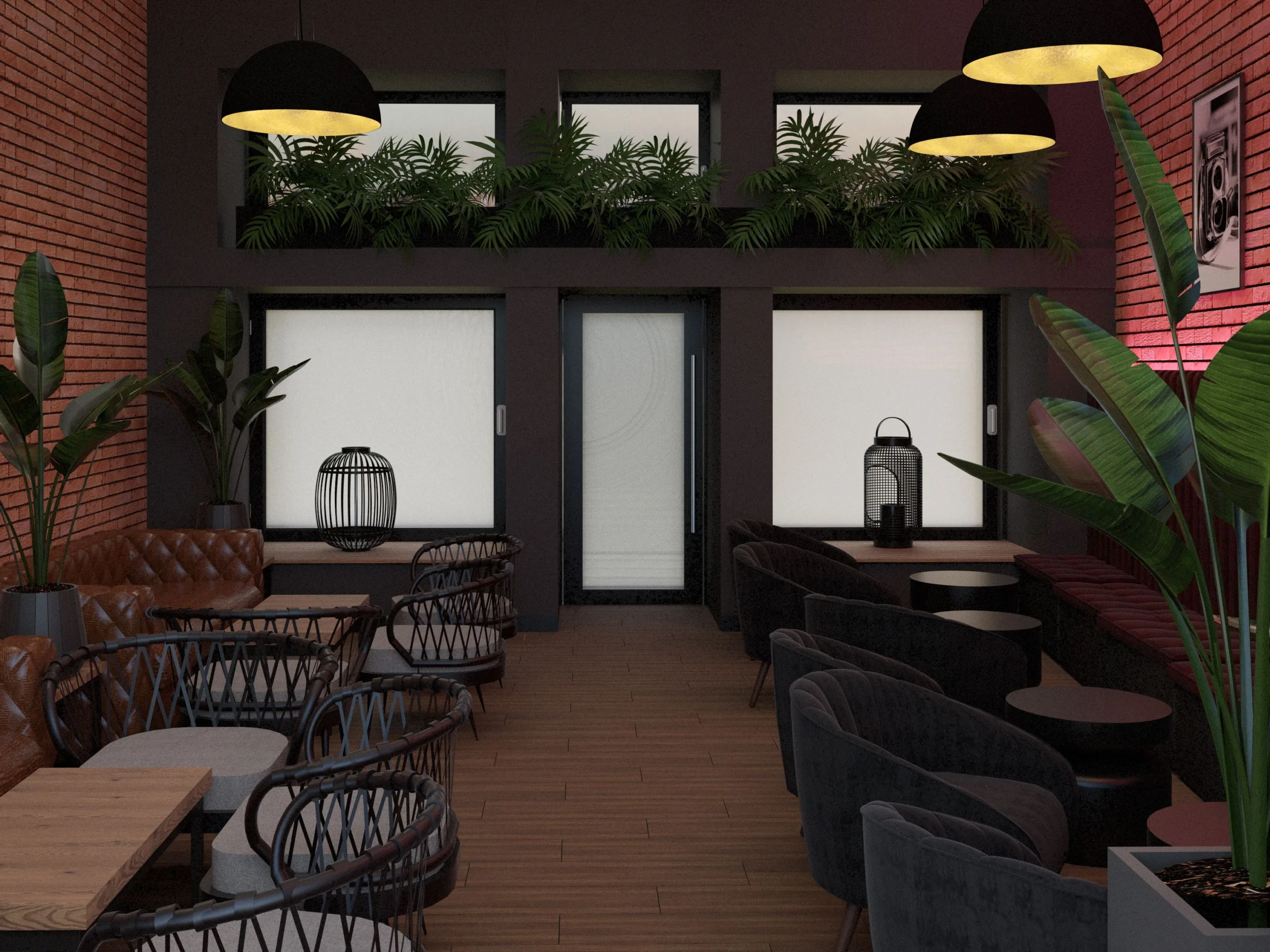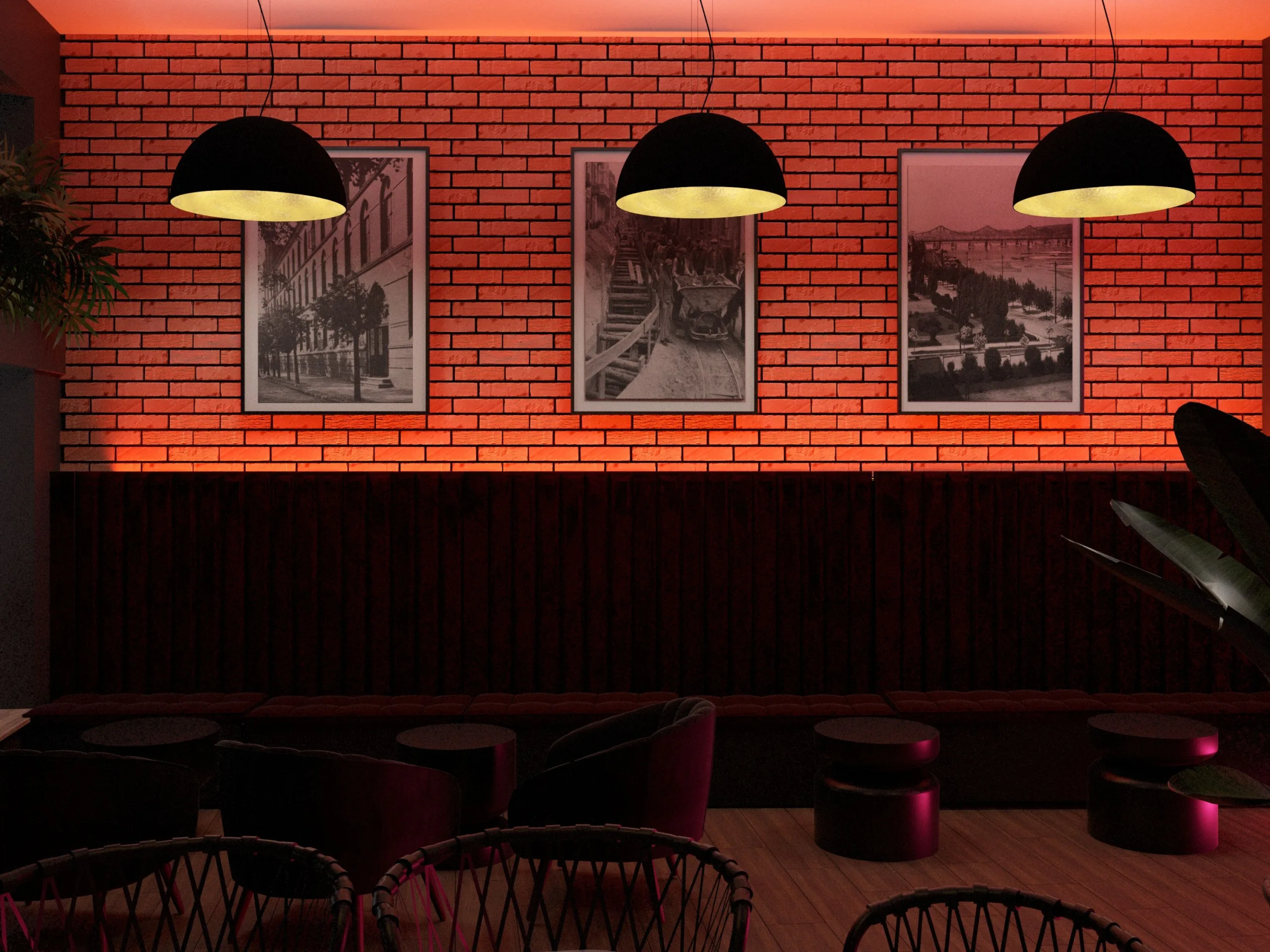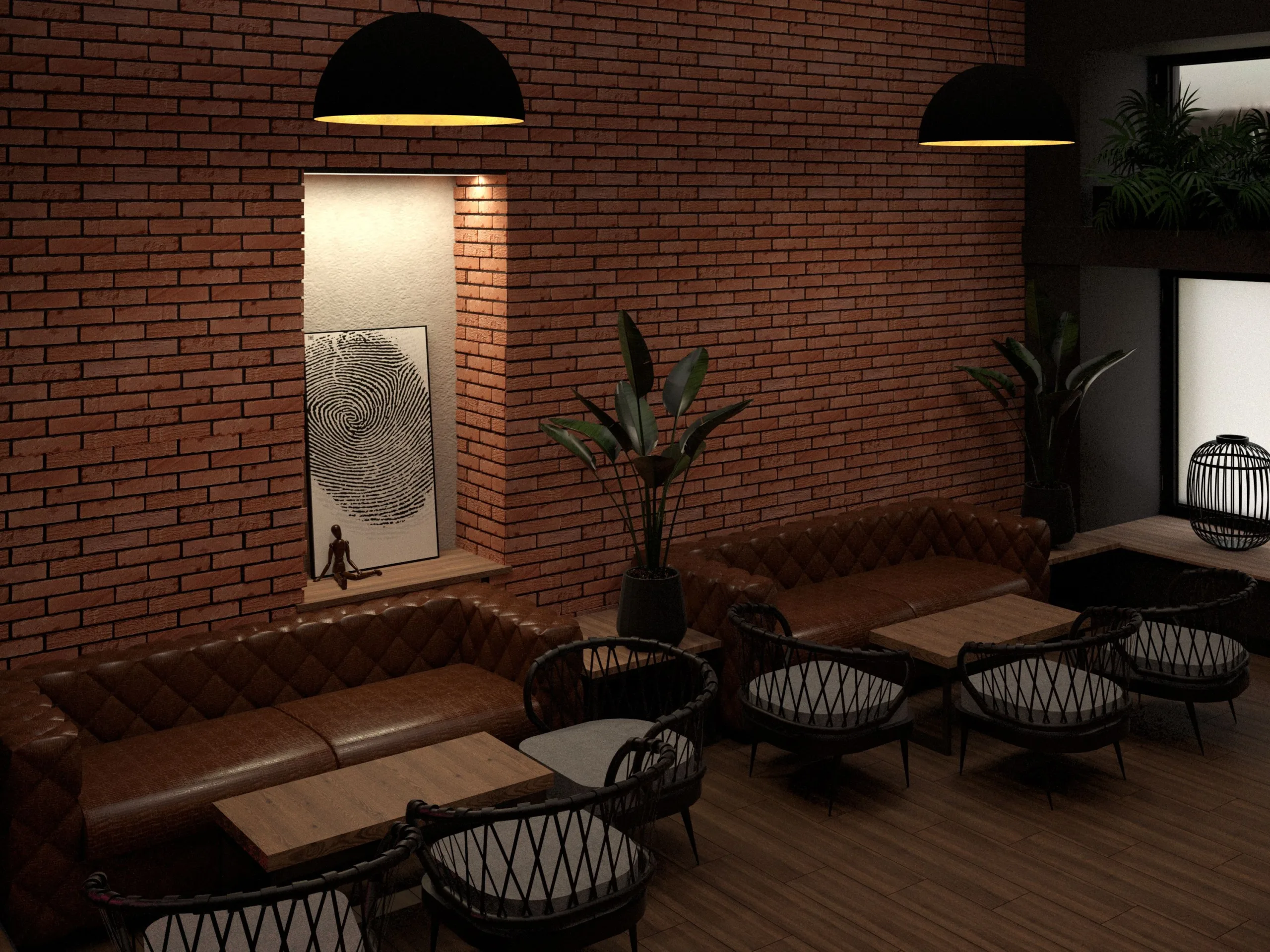 Wnętrze utrzymane jest w klimacie nowoczesnego loftu — surowego, ale jednocześnie zapraszającego. Oryginalna cegła staje się głównym bohaterem przestrzeni: jej naturalne przebarwienia, nierówności i historia tworzą tło, które nadaje miejscu charakteru i autentyczności. Całość jest zbalansowana różnorodnym światłem, naturalnymi materiałami i subtelnymi akcentami w stylu urban chill.
