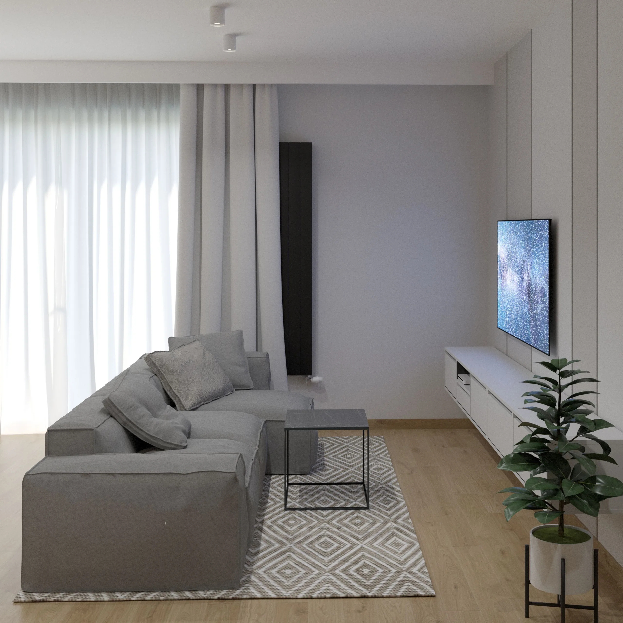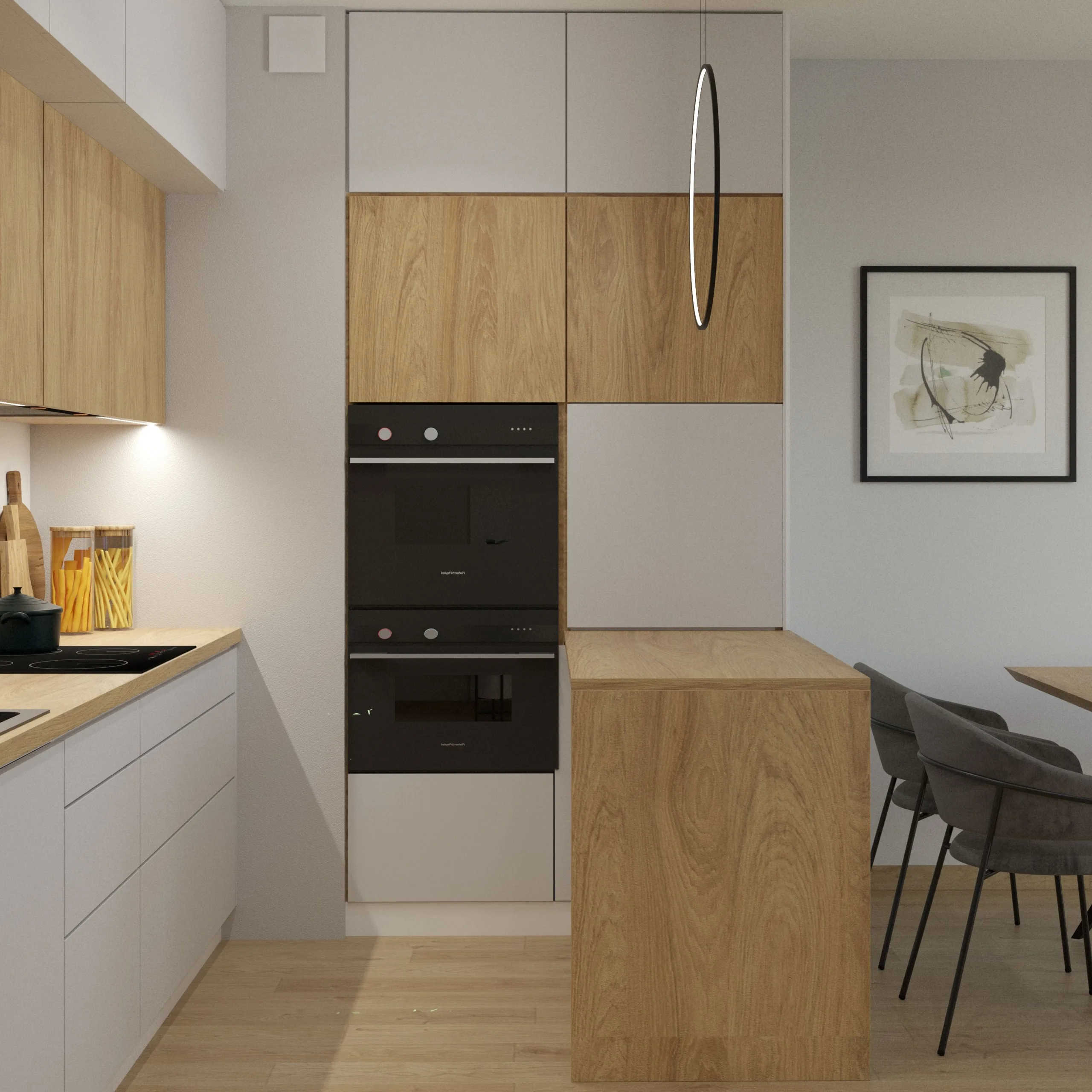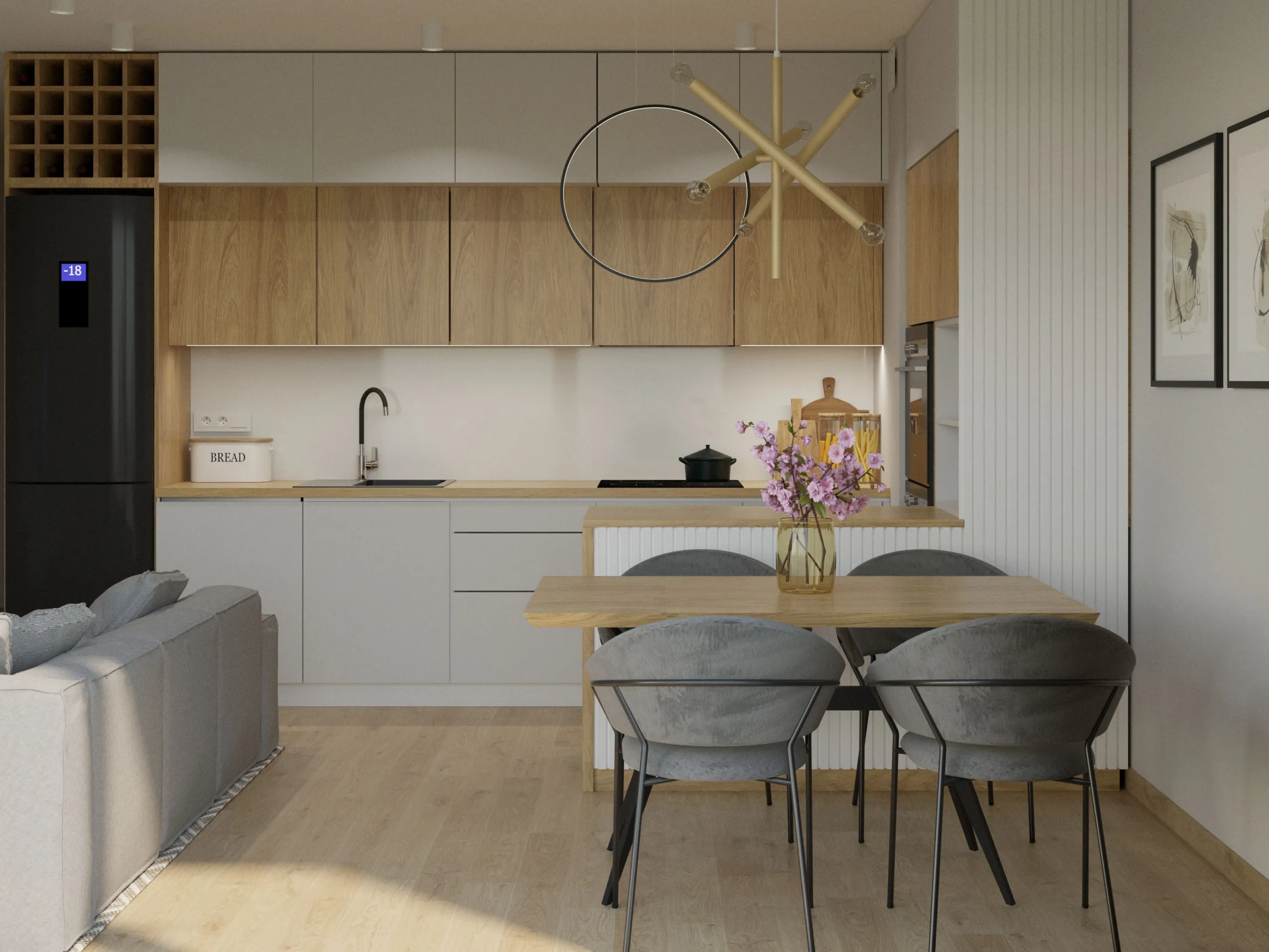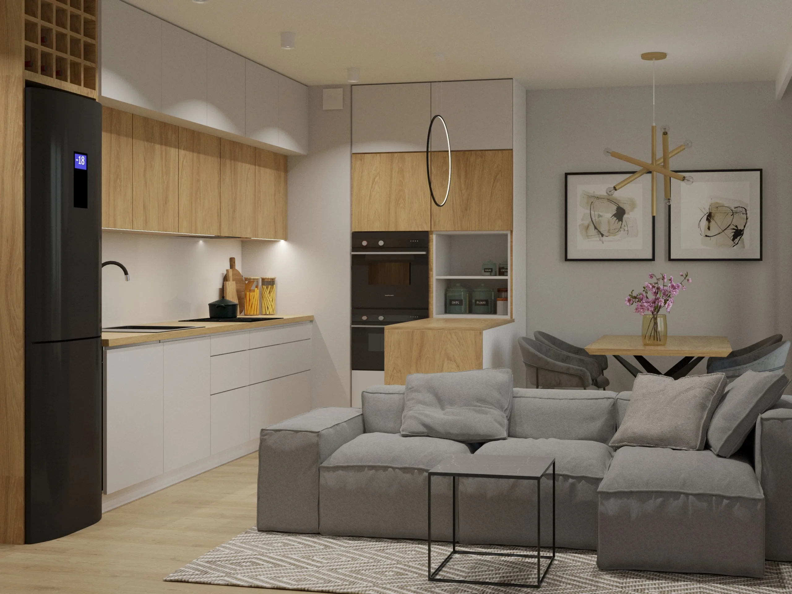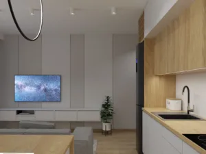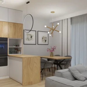 Ten nowoczesny salon z aneksem kuchennym w łódzkim apartamencie, w pobliżu Manufaktury łączy minimalizm z ciepłem domowej przestrzeni. Strefa wypoczynkowa jest prosta i komfortowa – mieści się tu wygodna sofa i długa rtv-ka podwieszona nad podłogą. Jasne ściany i duże okna podkreślają miejski charakter wnętrza. Aneks kuchenny również w jasnych kolorach, z nowoczesnym oświetleniem i dobrze przemyślanym układem funkcjonalnym, tworzą spójną całość z salonem.